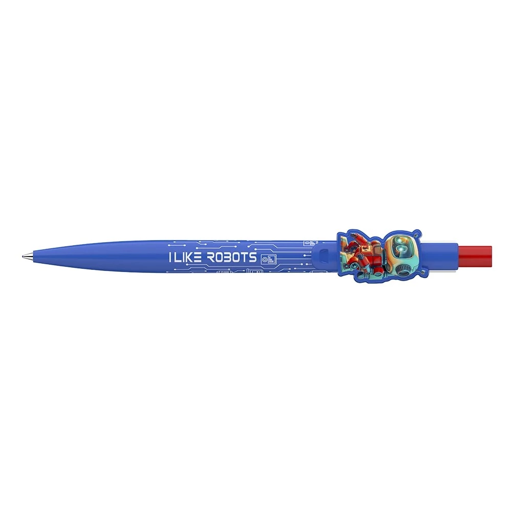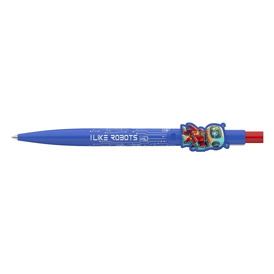 Nyomógombos mechanikával működő golyóstoll, robot fomájú klipsszel. Cserélhető X-20-as kék színű golyósbetéttel. Írásvonalvastagság: 0,8 mm.